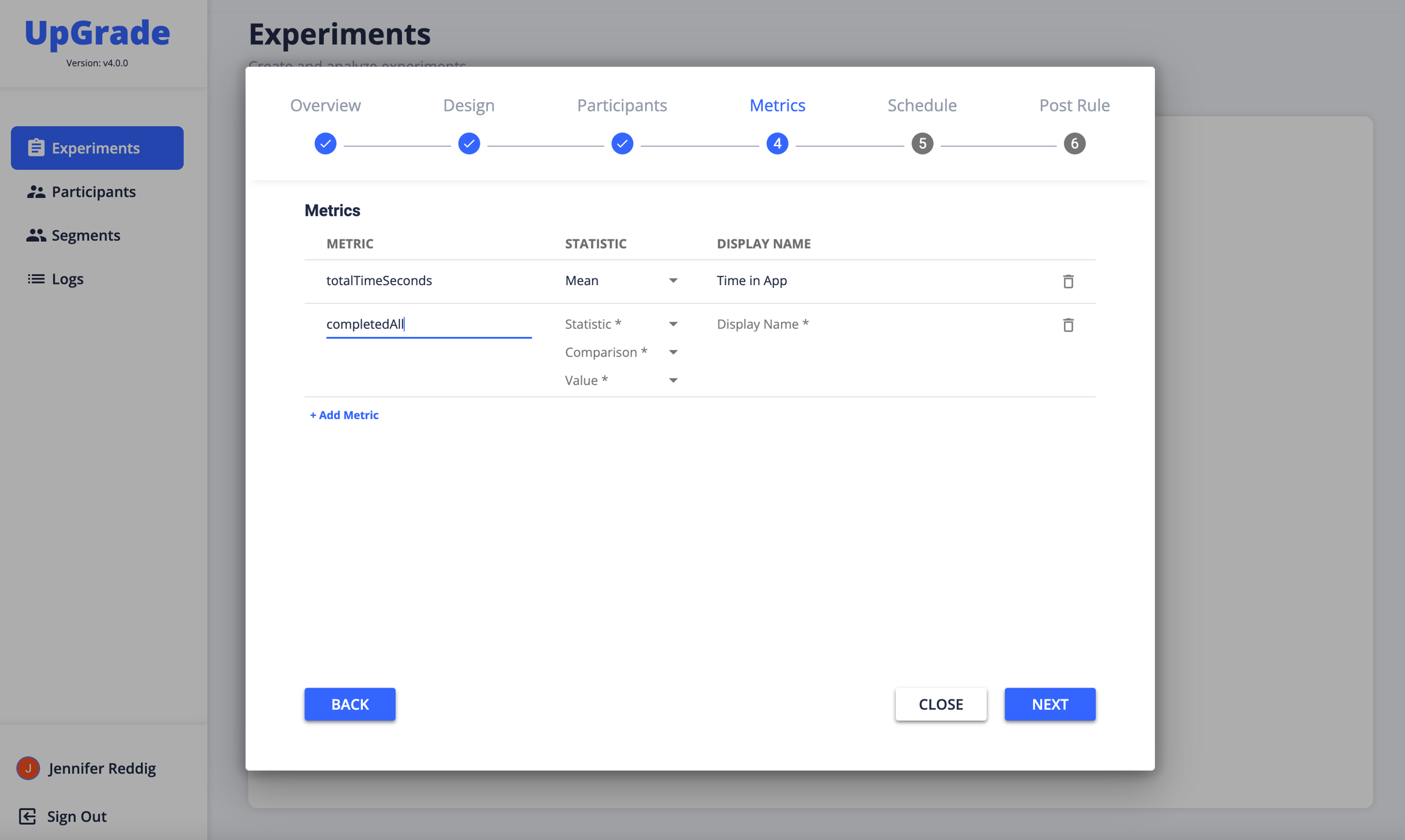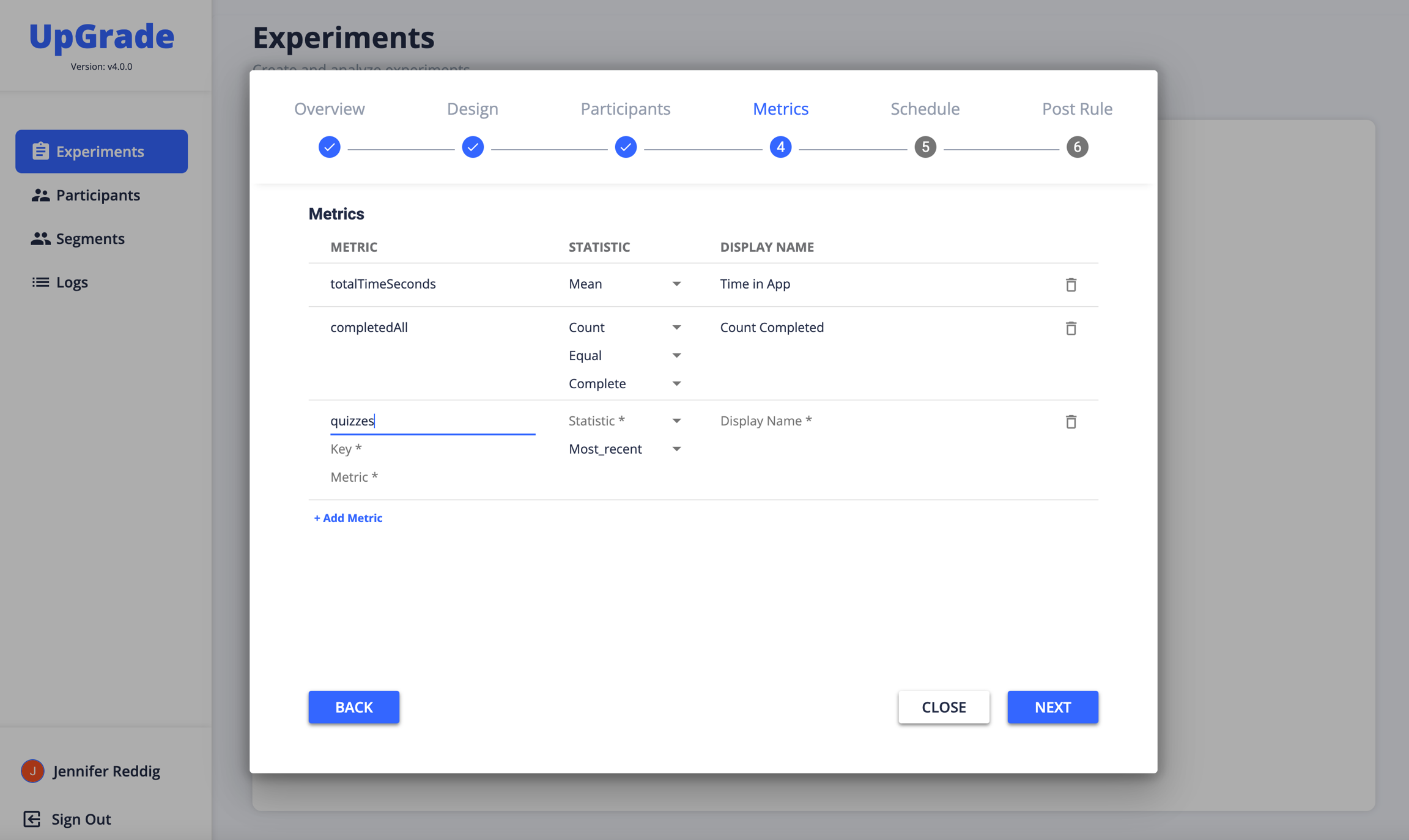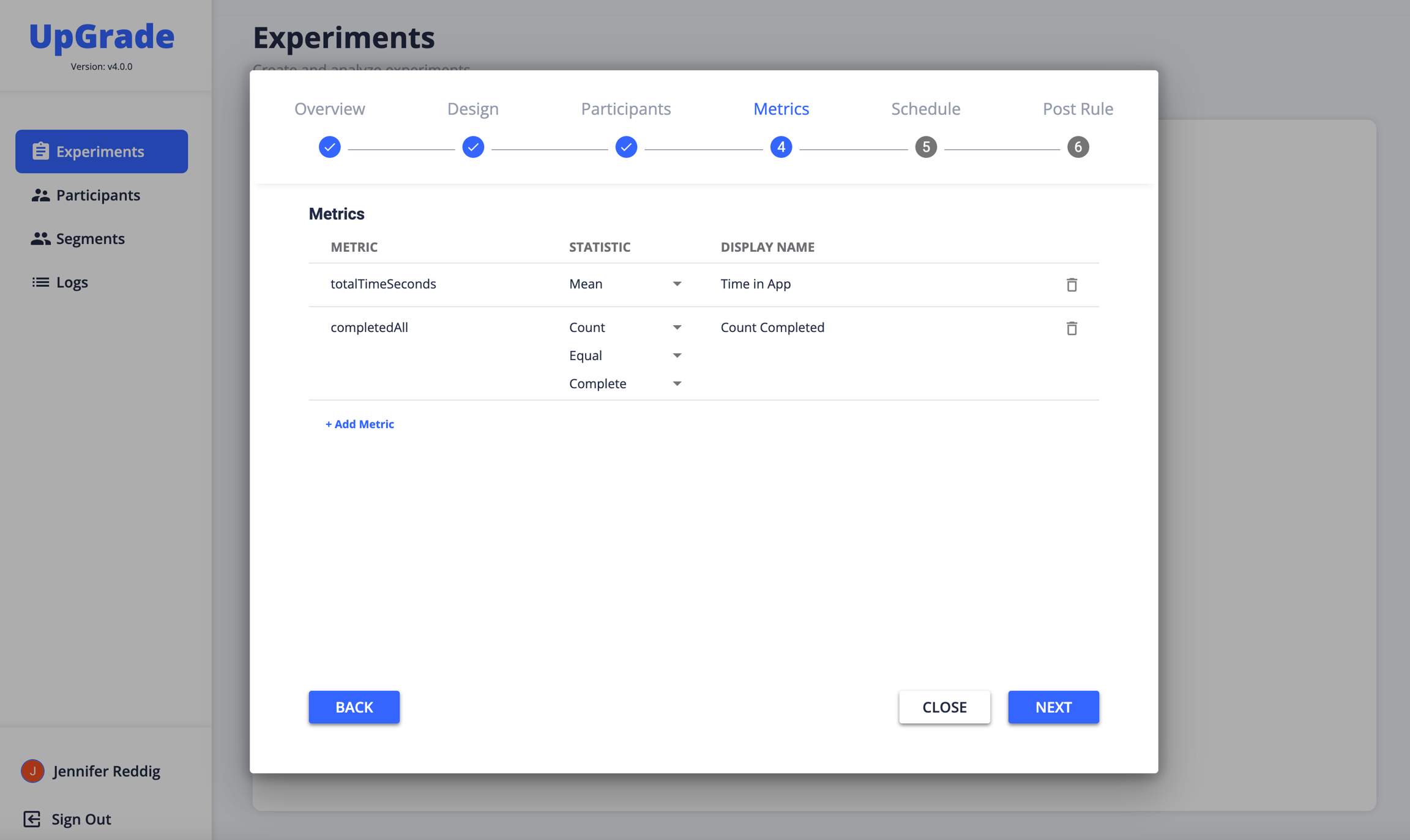 Once you've defined the metrics you'll be collecting, you can attach metrics to an experiment. The metrics defined in METRICS are now available in the Experiment creation stepper.