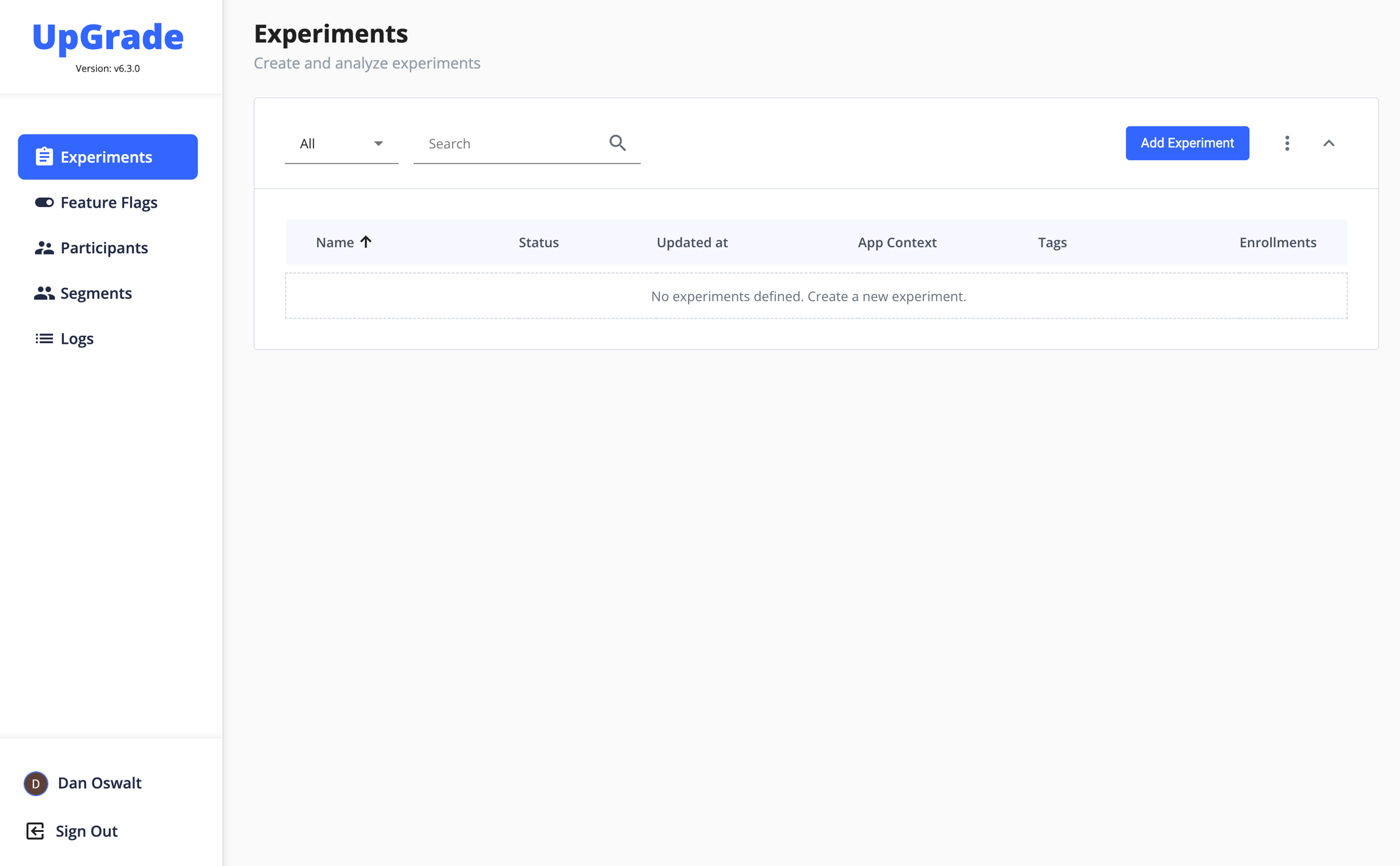 After UpGrade has been set up on your cloud infrastructure using the instructions in the Developer Guide, navigate to your instance of UpGrade. After logging in using your credentials, you should see the UpGrade home page.