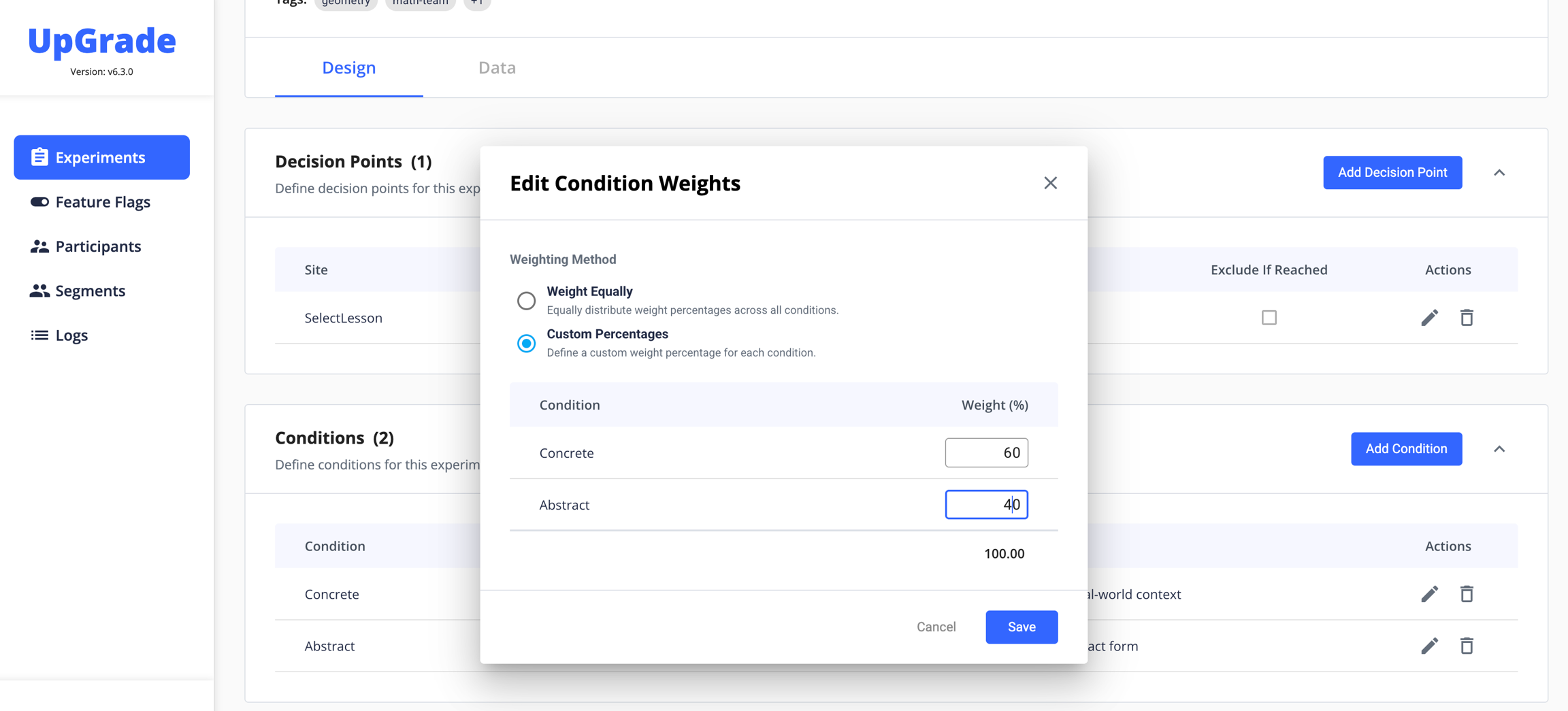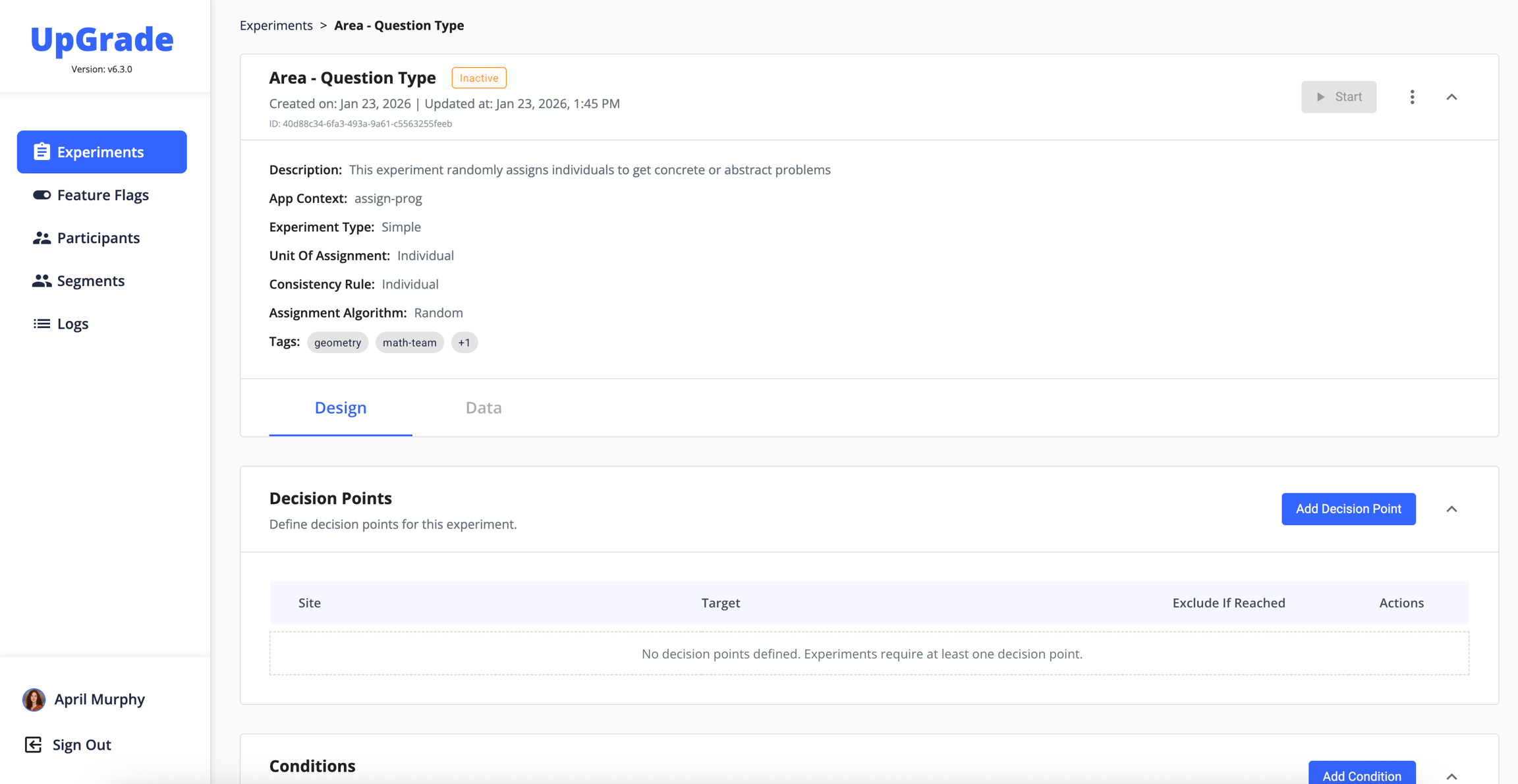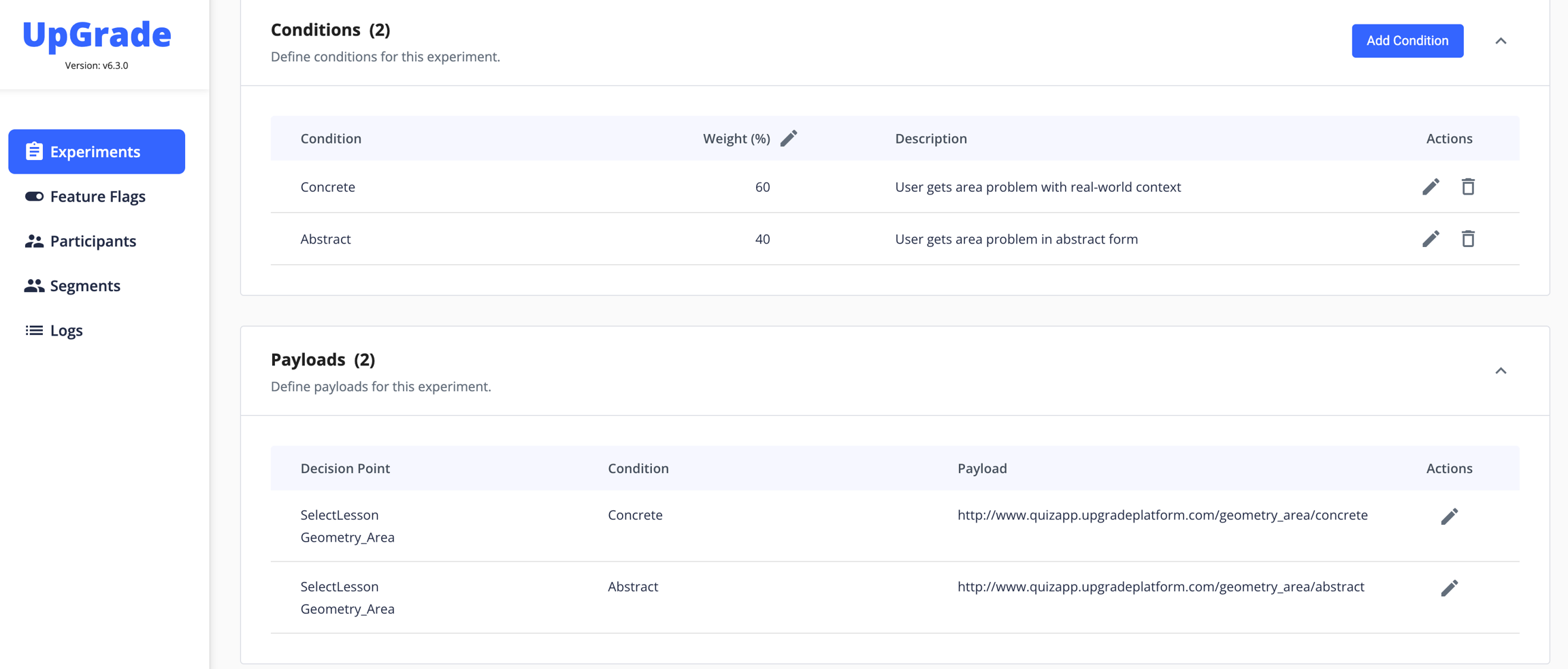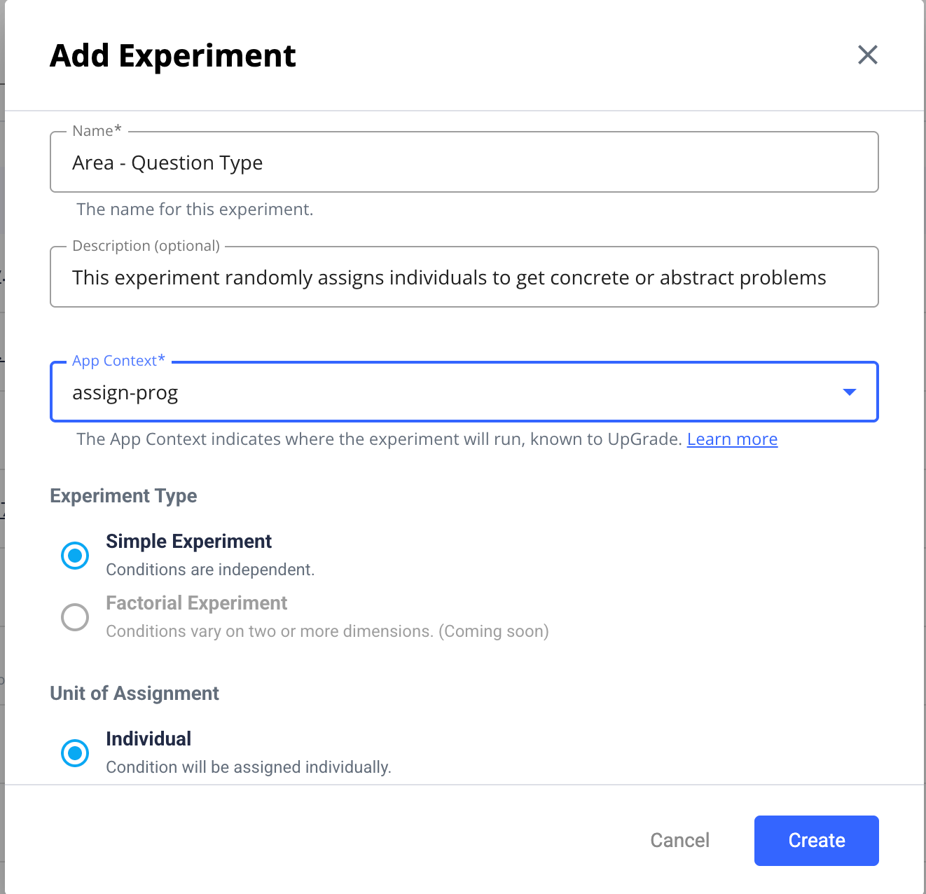 The web portal of UpGrade provides an easy way to manage A/B testing in your educational software. This is a step-by-step guide to setting parameters and launching an experiment in the UpGrade UI. In this example, we will set up a Simple Random experiment with Individual unit of assignment that compares the effectiveness of two different versions of the same lesson: one concrete, and one abstract.