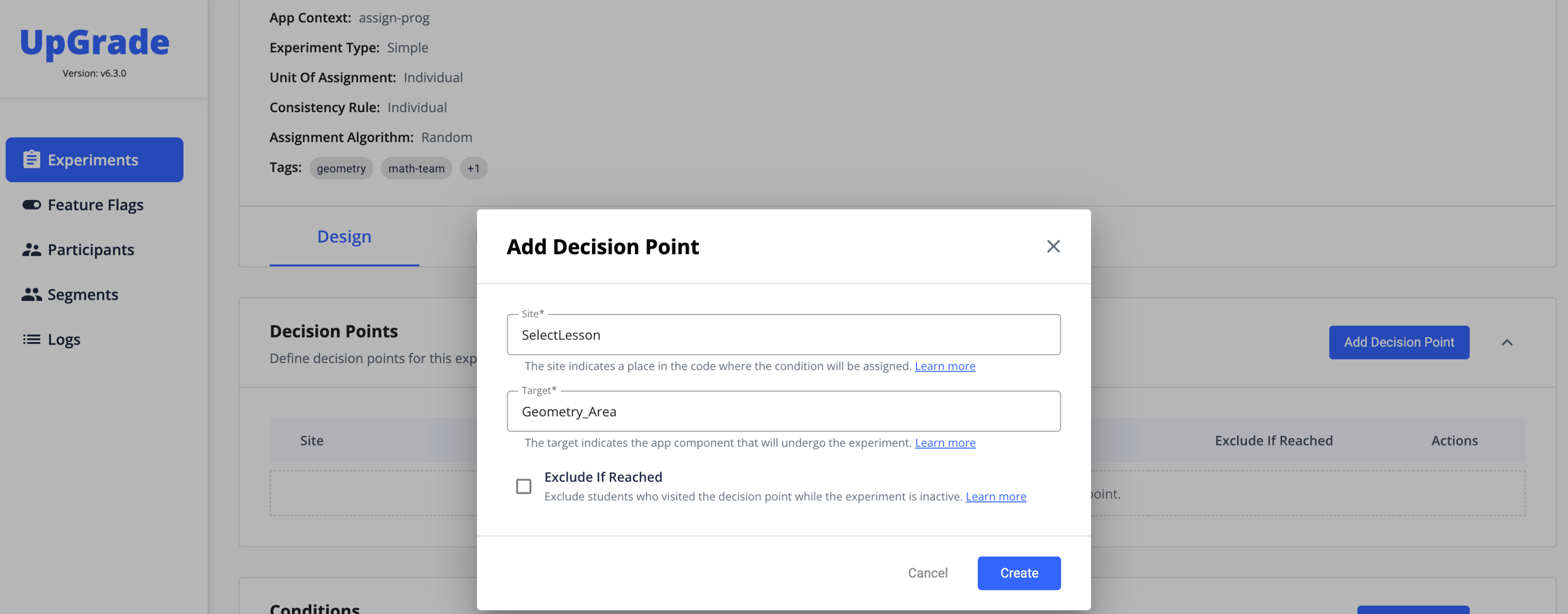 Every experiment requires at least one Decision Point. Each decision point is represented by its corresponding Site and Target. Decision points are the place or function in the client code where the conditional code execution happens--aka, where the UpGrade API call to markExperimentPoint occurs. An example of a Site could be a function called SelectLesson, and the Target could be the specific lesson Geometry_Area. From the table in the Experiment Detail page, select Add Decision Point. In the corresponding modal, enter the information for your decision point.