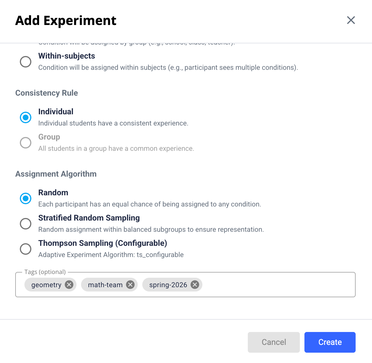 Finally, Assignment Algorithm allows you to choose between simple weighted Random (with equally or unequally weighted conditions), Stratified Random Sampling (where subgroup characteristics are uploaded separately and randomization takes into consideration these strata), and Thompson Sampling, an adaptive algorithm that dynamically adjusts condition weights based on a reward metric. More about the algorithms and how they work can be found under the Creating an Experiment tab in the menu.