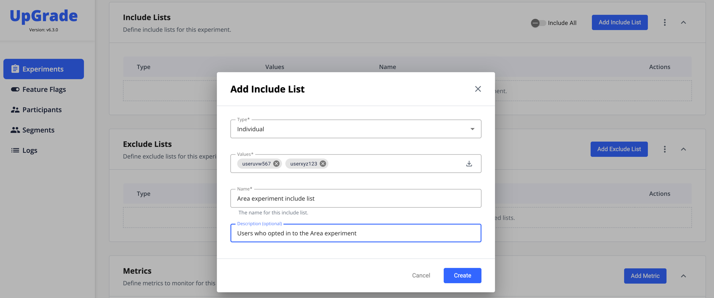 See the menu item on Metrics for detailed information on how to define metrics in an experiment.