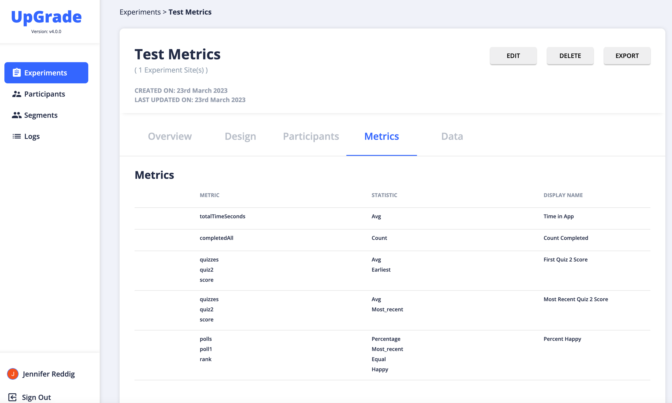 UpGrade will NOT save any logged metrics UNLESS they are attached to an experiment!
