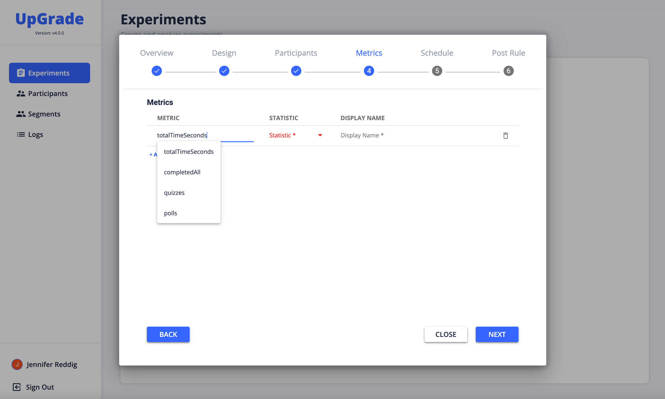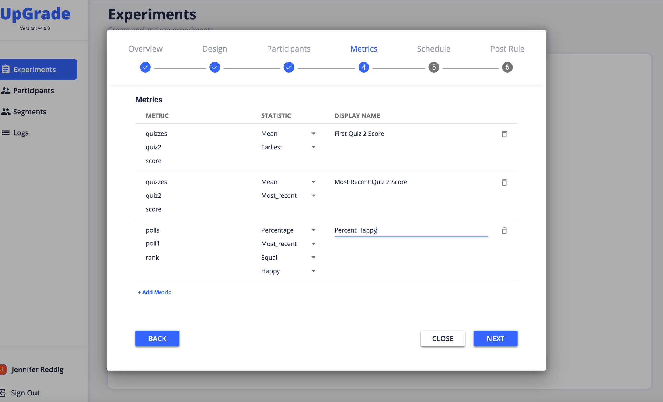 Once you've defined the metrics you'll be collecting, you can attach metrics to an experiment. The metrics defined in METRICS are now available in the Experiment creation stepper.