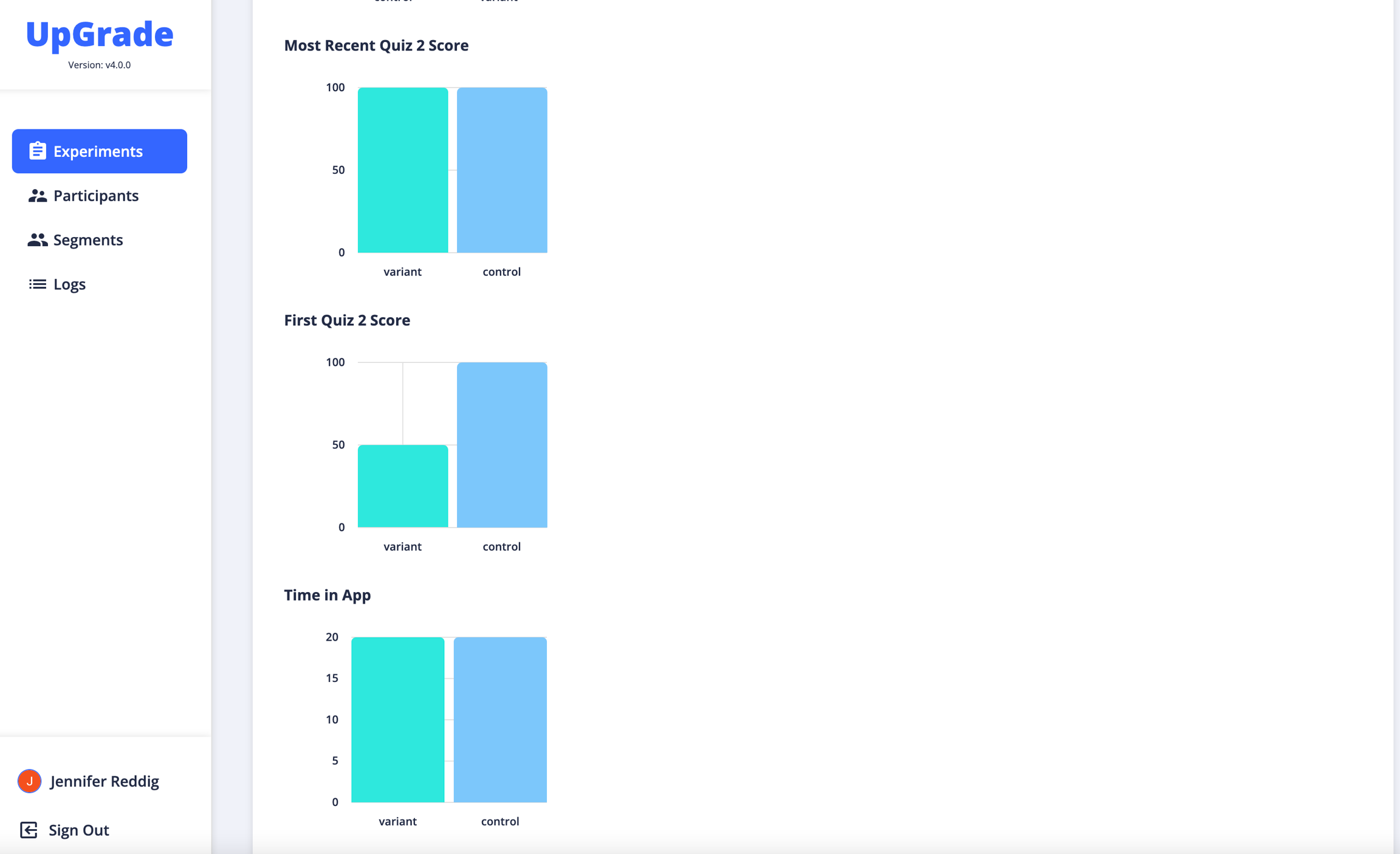 In the screenshots below, we're collecting the average first score on Quiz 2 and the average latest score on Quiz 2. We're also measuring the percentage of users that most recently voted "Happy" in Poll 1.