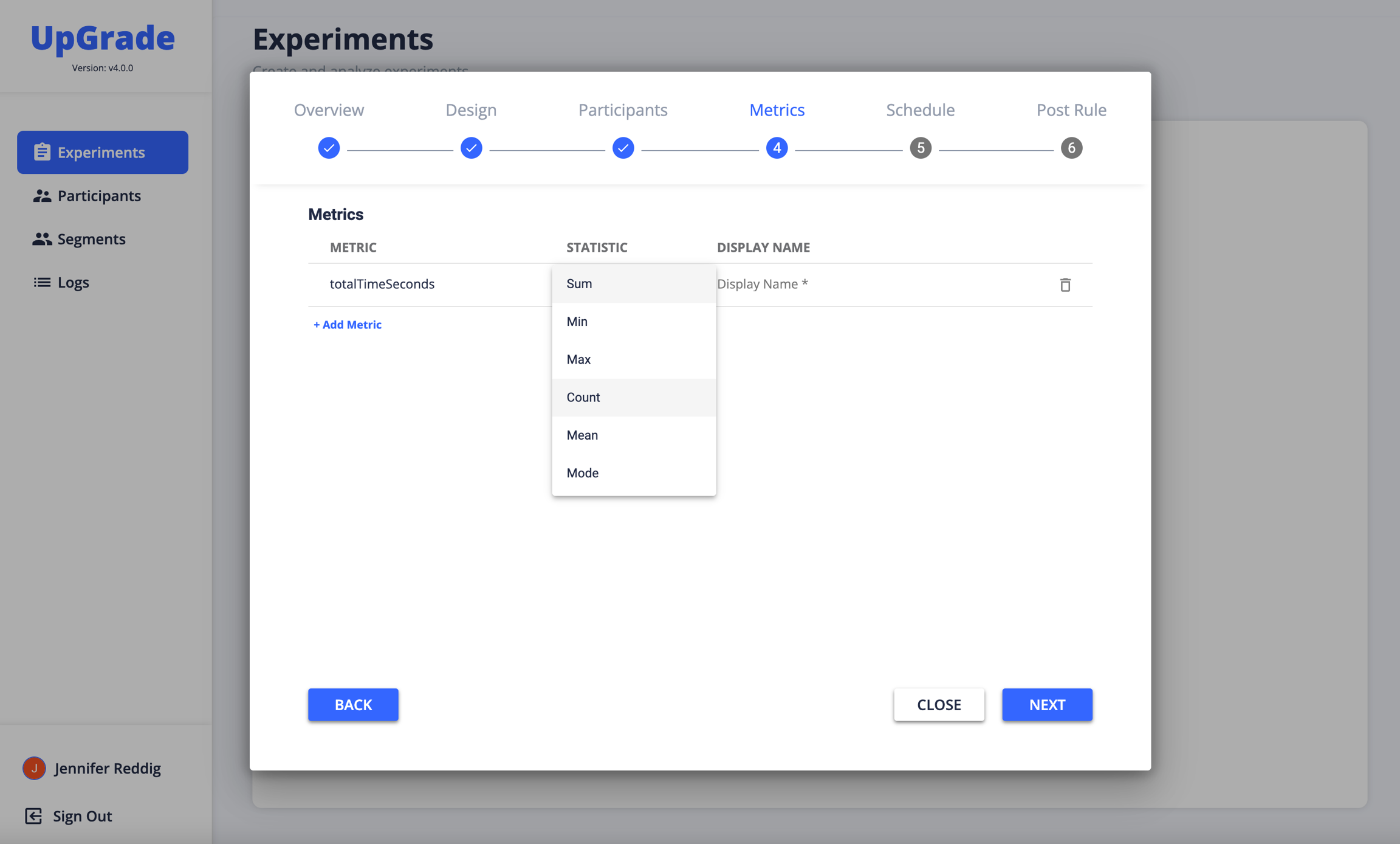 When selecting a continuous simple metric, you choose the statistical operation (defined in OPERATION_TYPES enum below) and a display name.