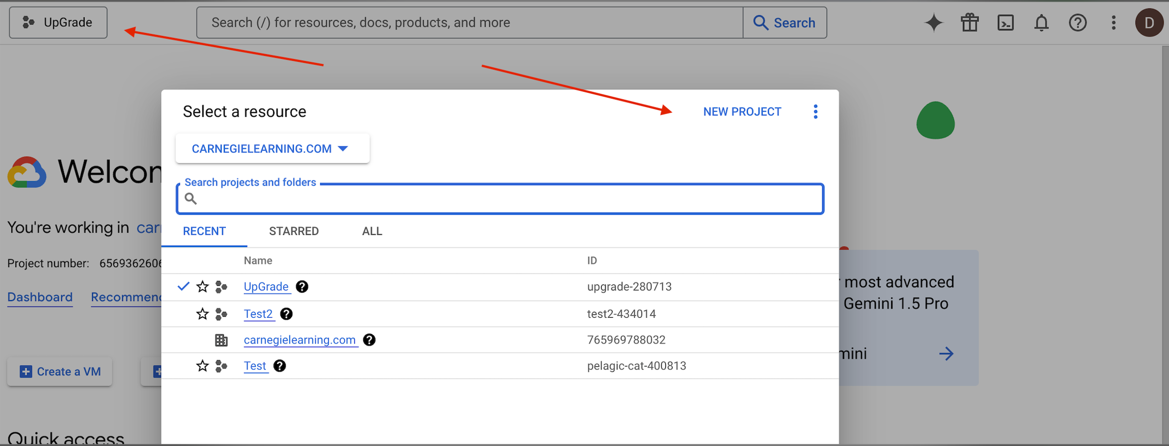 Go to console.cloud.google.com and click Console. You should see something like this, but sometimes this UI is not exactly the same, and may be different if empty. On left is the project selector, and New Project is there on the right.