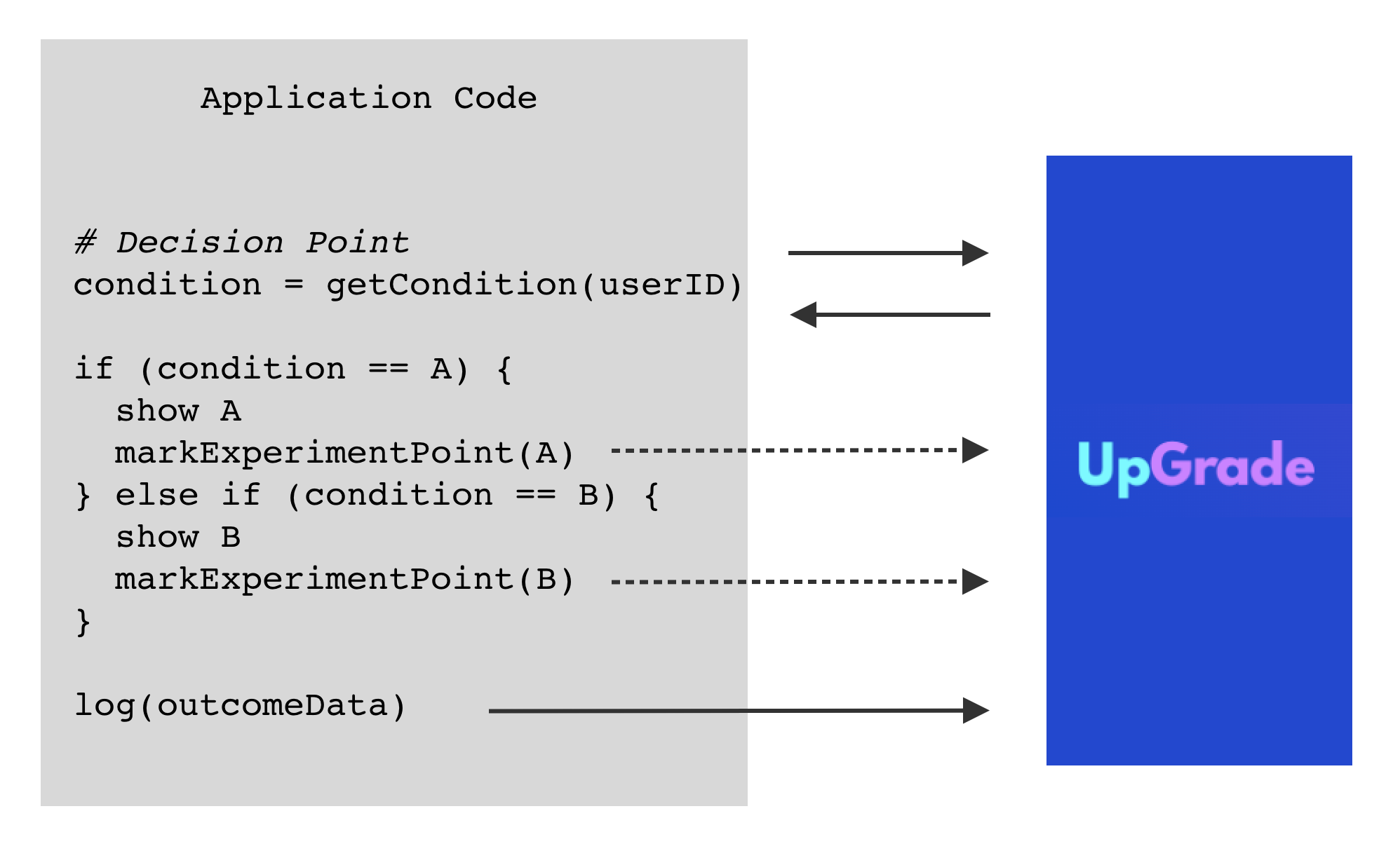 Here is the key idea: Every place in the code where we can randomly show learning experiences to the users becomes a decision point. At this decision point, we send the user's ID and ask it to assign a condition to that user ID. Based on the condition returned by UpGrade, we can give the appropriate experience to the user.