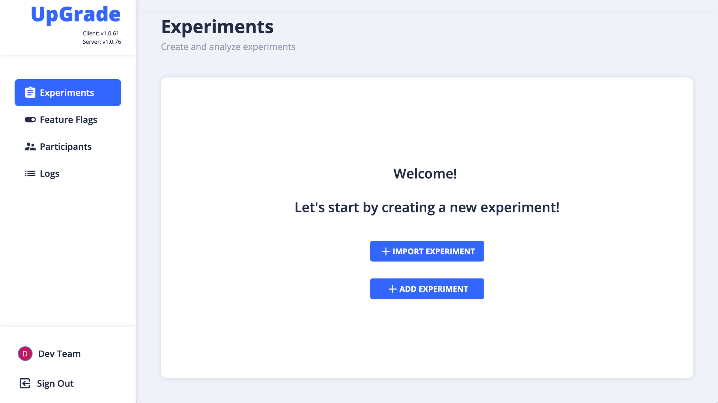 After UpGrade has been set up on your cloud infrastructure using the instructions in the Developer Guide, navigate to your instance of UpGrade. After logging in using your credentials, you should see the UpGrade home page.
