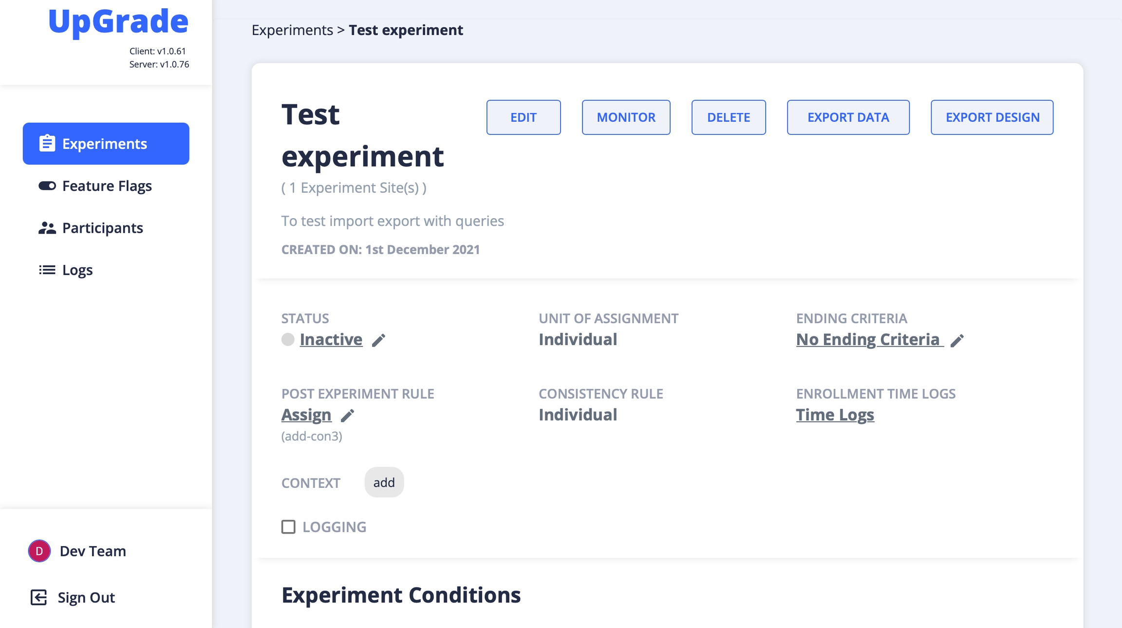 There are two options provided to export experiment details. You can either export the experiment design in JSON format by clicking on EXPORT DESIGN button or export the experiment data in CSV format by clicking on EXPORT DATA button.