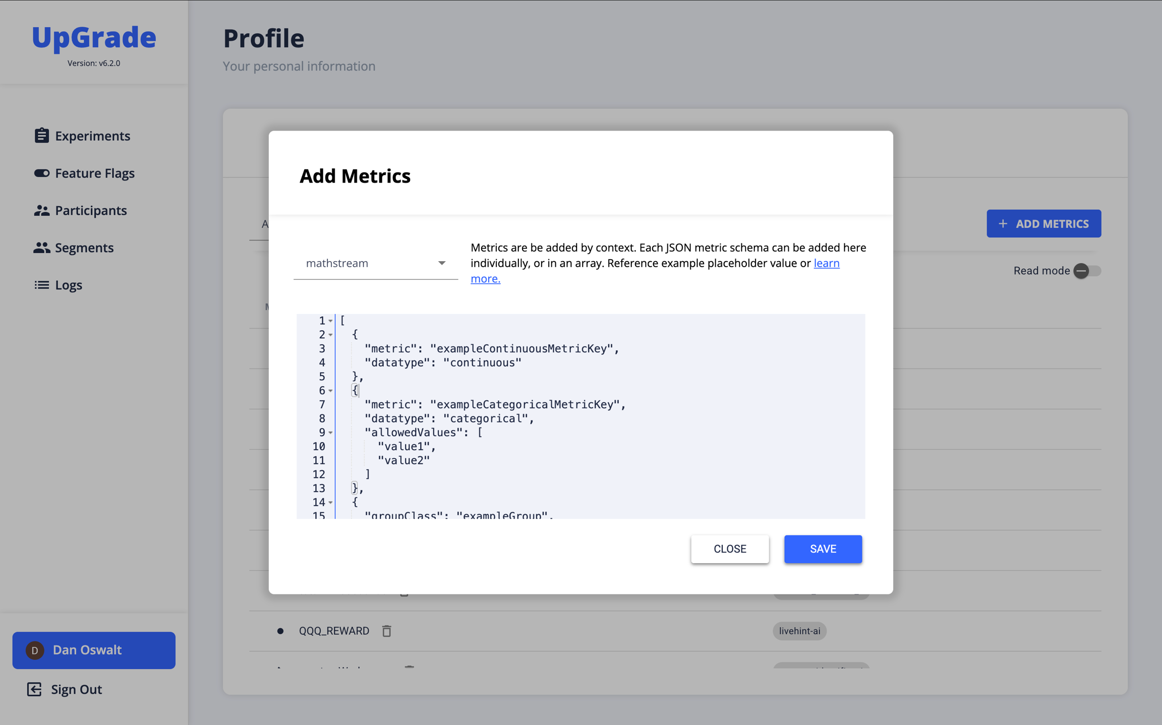Within these two types of metrics, metrics can be categorical or continuous. Continuous metrics are numerical and can take on any number value. Categorical metrics have discrete, separate groups and the groups must be defined in the environment variable. Metrics can also be defined using the add-metrics editor found under "Profile" in the UI, or programmatically via the /metric POST API.