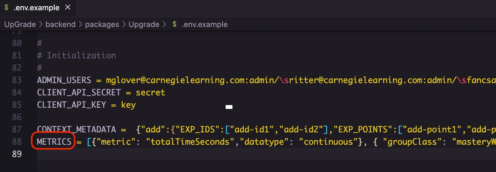 Let's say in your educational application, you have three quizzes ("Quiz 1", "Quiz 2", and "Quiz 3") which users are allowed to take multiple times. You also have two polls ("Poll 1", "Poll 2"), which can only be attempted once. You want to record the total time a student spends in your application, whether the a student has completed all activities, the score, time spent, and pass/fail status of each quiz, and the time spent and result from each poll. You might define your METRICS as: