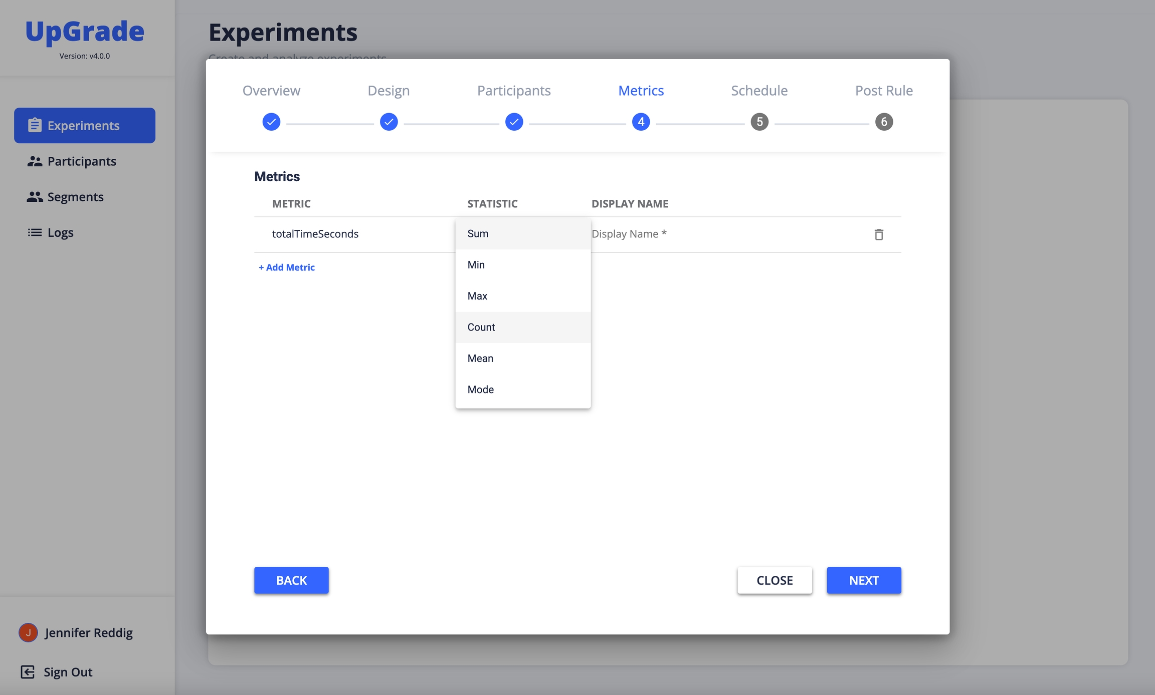 Once you've defined the metrics you'll be collecting, you can attach metrics to an experiment. The metrics defined in METRICS are now available in the Experiment creation stepper.